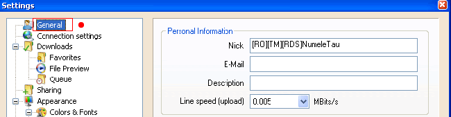 • În ferereastra nouă deschisă selectaţi „ General“(imagine de mai jos), la nick după cum vedeţi şi în imagine, se va scrie între paranteze pătrate de genul [RO][TM][RDS]Nume, unde [RO] reprezintă ţara, [TM] reprezintă prescurtarea oraşului dumneavoastră, [RDS] se va scrie providerul dumneavoastră de internet ( ex. [ClickNet], [UPC], [Orange], etc.). Următoarele trei căsute ( Email, Description, Line Speed) se completează opţional.