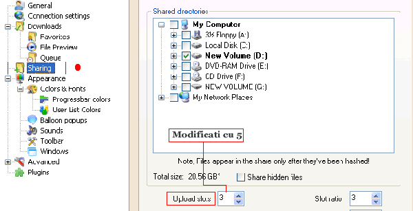 • 5 este “ Sharing „ . Aici trebuie sa punem si noi la dispozitia altora informatie ( ex. muzica, filme, jocuri etc.) pentru ca majoritatea huburilor pe care o sa ne conectam ne cer asta. De preferabil este sa dam share la cat mai multe fisiere. Tot in pagina de setari facem click pe “ Sharing „ ( imagine de mai jos ) si in partea dreapta ne va aparea sistemul nostru cu toate partitiile. Acolo selectam o partitie, la alegere, unde avem fisiere pe care am vrea sa la punem la dispozitia celorlalti utilizatori. Apoi apasam “ Ok„. Program va face hashing şi puteţi apasa „run in background“. Doar dupa procesul complet de hashing share-ul dumneavoastra va fi vizibil altor utilizatori Foarte important, tot in aceast meniu de “ Sharing„ avem o alta optiune „Upload slots“, care reprezinta numarul de conexiuni suportate pe calculatorul dumneavoastra, această valoare trebuie să fie proportionala cu numarul de huburi pe care sunteti conectat - cam 4 sloturi pentru fiecare hub, deci daca va conectaţi pe 10 huburi acest numar ar trebui sa fie de minim 40.