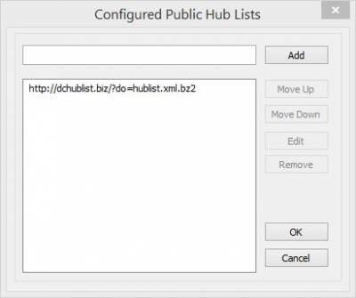 • se va deschide o noua fereasrea, acolo in a doua casuta selectati adresele existente si apasati “ Remove„ pentru a le inlatura. Dupa ce ati inlaturat toate adresele cu huburi din strainatate copiati una dintre adresele de aici (preferabil din RO) https://dchublist.biz/?do=hublist&get=hublist-ro.xml.bz2 pe care o puneti in prima casuta si apasati „Add“. Aceasta lista va foloseste la adaugarea de noi huburi. Mai multe hublisturi gasiti aici: