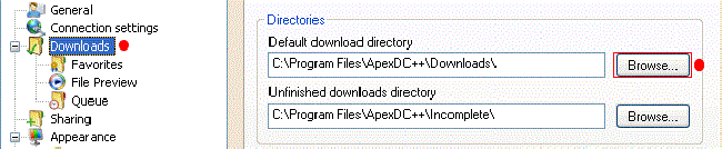 • acolo veţi observa în partea dreaptă „ Default download directory “ care este setat să salveze fişierele în directorul de baza al programului (implicit) dar noi nu dorim să se întample acest lucru deoarece directorul se află în partiţia cu sistemul de operare şi adesea aceasta este mai mica decât restul partiţiilor, iar fişierele descărcate de către noi ar putea să umple partiţia până la refuz. În concluzie va trebui să selectam o alta partiţie. Putem face aceasta apăsând butonul alăturat „ Browse “ care deschide o nouă fereastră pentru selectarea noii partiţii şi preferabil a noului director de „ downloads “ . „Unfinished downloads directory“ este directorul unde sunt salvate fişierele temporare sau neterminate. Acest director este necesar pentru a relua un download care a rămas neterminat din diferite motive . Poate fi lasat nemodificat.